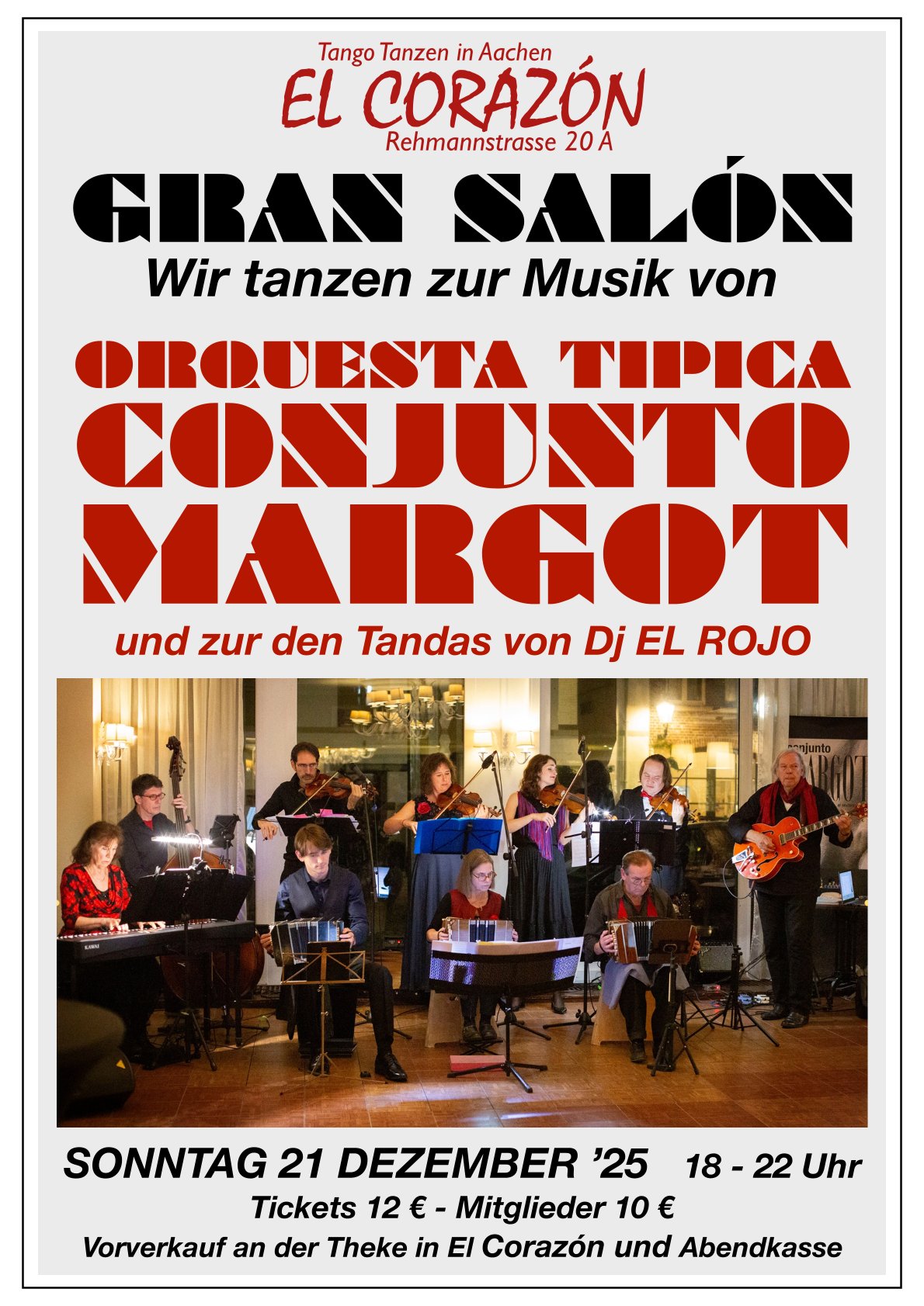 Der Verein Tango Aachen e.V. organisiert in seinen Tanz- und Clubräumen, dem legendären El Corazón in Aachen, Tangokonzerte, Milongas und Praktika mit hervorragenden Tango-Ensembles und DJs. Im El Corazón finden auch Tangokurse bei namhaften Tanzlehrerinnen und Tanzlehrern statt. Der Verein legt besonderen Wert auf eine freundliche und angenehme Atmosphäre, bei der sich alle Gäste wohlfühlen. In den Sommermonaten finden die Sonntag-Milongas auch open-air am Elisenbrunnen in Aachen statt. Die Tanz-Atmosphäre an diesem schönen und traditionsreichen Ort hat ihren ganz besonderen Charm.