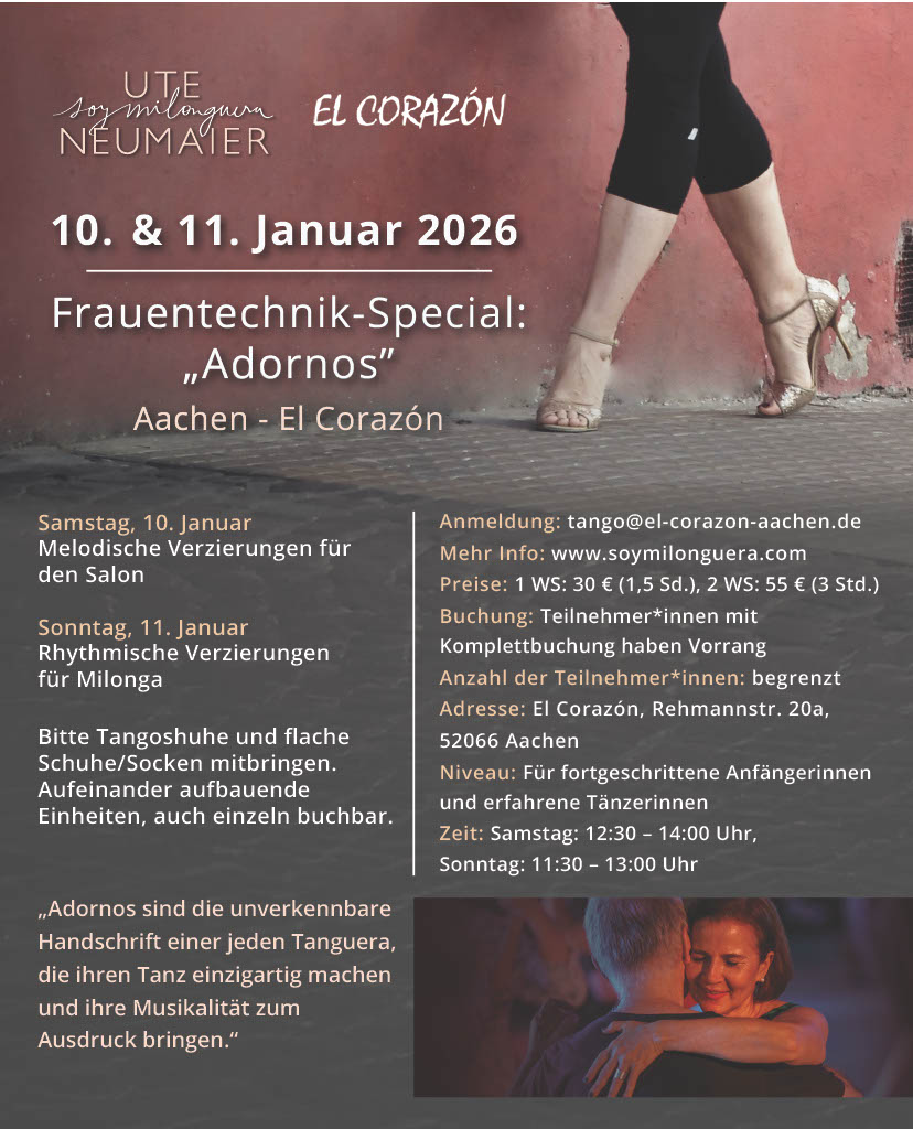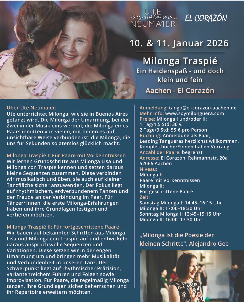 Um unseren monatlichen Newsletter mit den aktuellen Veranstaltungen zu erhalten, schreibe bitte eine kurze e-Mail an tango@el-corazon-aachen.de.
